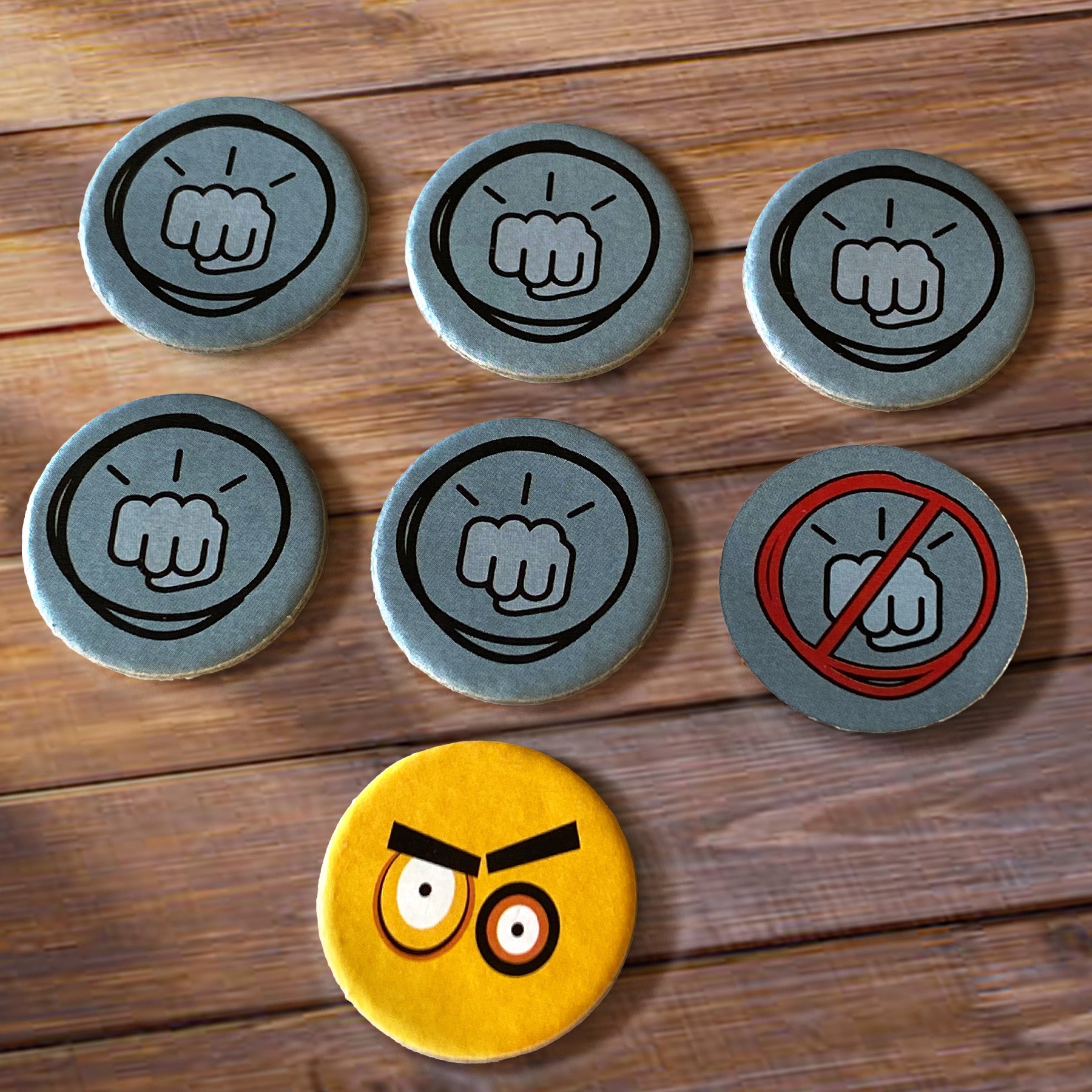 Masywny, drewniany pionek z nadrukiem na obu stronach.