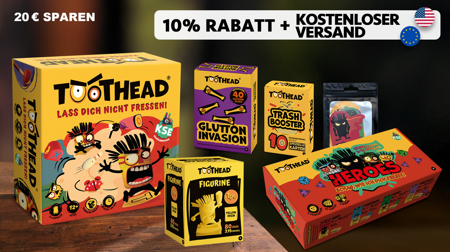 Verbessere dein Spielexemplar oder gönn dir ein Gadget mit dem TOOTHEAD-Logo.